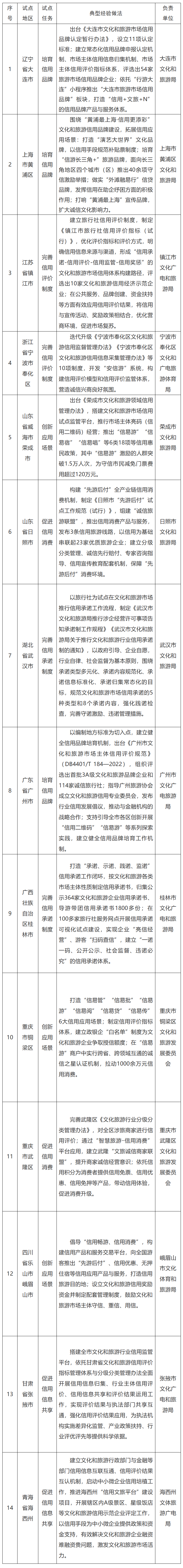 上述14个试点地区在文化和旅游市场信用经济发展试点工作中充分发挥积极性、主动性和创造性,在提升信用监管效能、探索信用交易模式、拓展信用应用范围等方面形成了一批典型经验做法。对上述试点地区和负责单位予以通报表扬。
