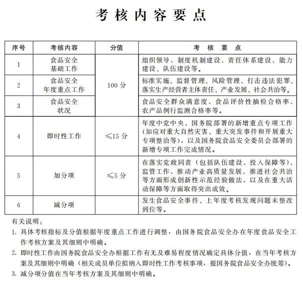 第五条 考核内容主要包括食品安全基础工作推进、年度重点工作落实、食品安全状况等,同时设置即时性工作评价和加减分项(考核内容要点见附件)。具体考核指标及分值在年度食品安全工作考核方案及其细则中明确,设置要科学合理,可操作、可评价、可区分,切实减轻基层负担。