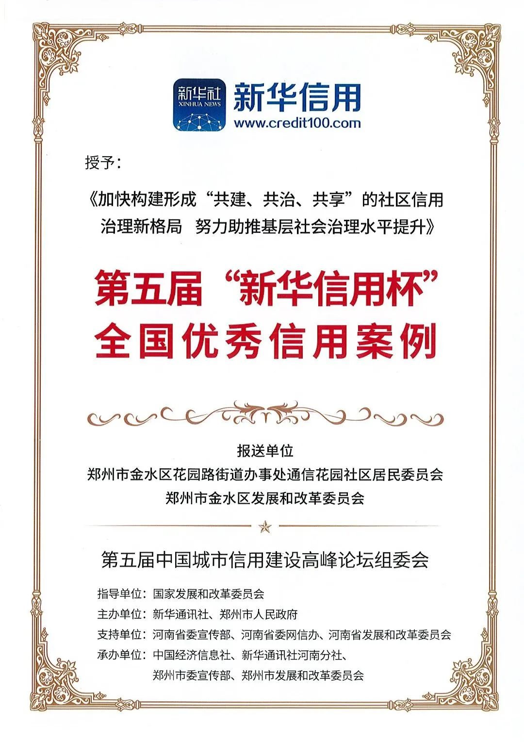 11月14日上午,第五届中国城市信用建设高峰论坛在郑州隆重开幕。大会重磅发布了180个“新华信用杯”全国信用优秀案例,金水区发改委和花园路街道报送的“加快构建形成‘共建、共治、共享’的社区信用治理新格局 努力助推基层社会治理水平提升”成功入选。